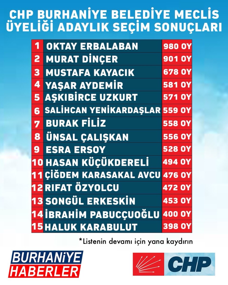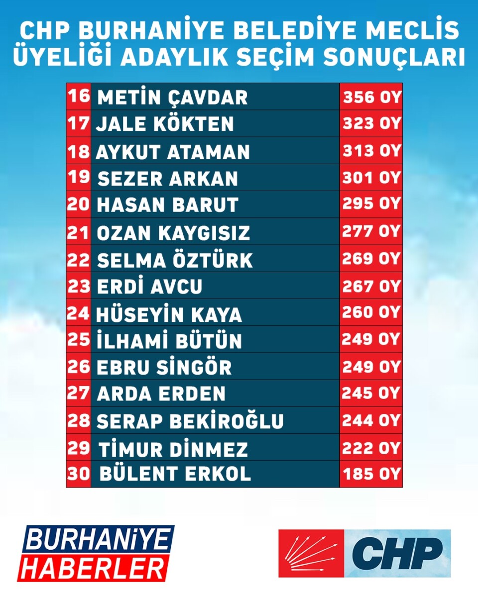 10 Şubat 2024 Cumartesi günü Reha Yurdakul Salonu’nda Burhaniye CHP Meclis Üyeliği Adaylığı için ön seçim gerçekleştirildi. İşte seçim sonuçları.