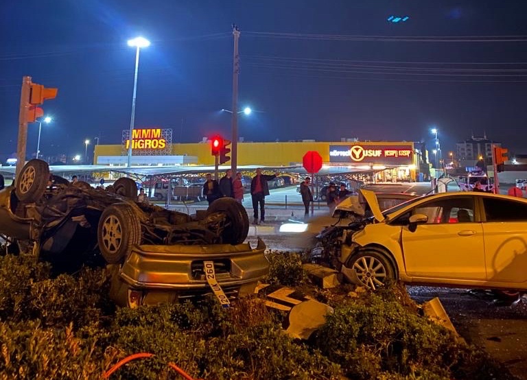 Balıkesir’in Burhaniye ilçesinde 2 otomobilin çarpıştığı kazada, ters dönen araç…